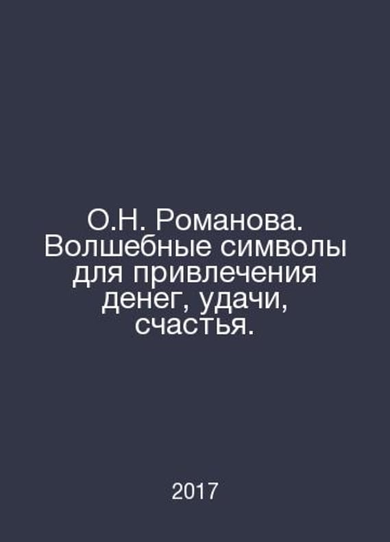 O.N. Romanova. Magic symbols to attract money, good luck, happiness. In Russian /O.N. Romanova. Volshebnye simvoly dlya privlecheniya deneg, udachi, schastya. M. RIPOL classic. 2017. Contact us for details or to request photos of available books. Delivery of this book could take longer than normal due to additional handling time before shipping, and no rush delivery options are available. Please let us know if you have a specific date by which you need to receive your order. SKUalb7fe615b0bf6423e8
