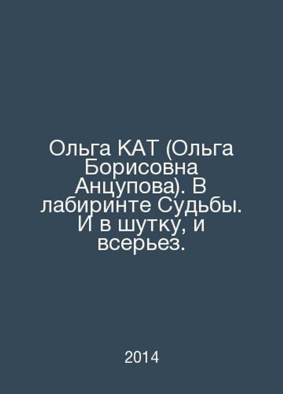 Olga KAT (Olga Borisovna Antsupova). In the labyrinth of Destiny In Russian /Olga KAT (Olga Borisovna Antsupova). V labirinte Sudby. I v shutku, i vserez. Literary and Art Edition. Nizhny Novgorod: DECOM, 2014 year.Contact us for details or to request photos of available books. Delivery of this book could take longer than normal due to additional handling time before shipping, and no rush delivery options are available. Please let us know if you have a specific date by which you need to receive your order.SKUalb8088d395725c93c6