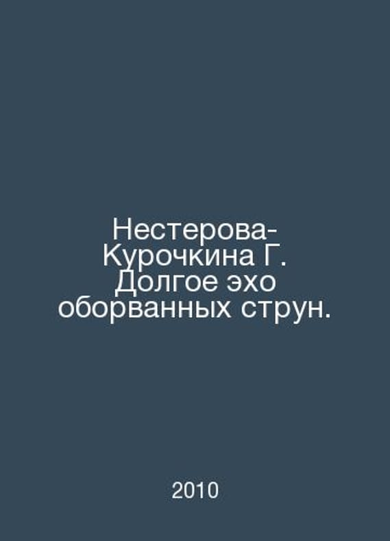 G. Nesterova-Kurochkina Long echo of broken strings. In Russian /Nesterova-Kurochkina G. Dolgoe ekho oborvannykh strun. Memories of St. Petersburg Rostock 2010. Contact us for details or to request photos of available books. Delivery of this book could take longer than normal due to additional handling time before shipping, and no rush delivery options are available. Please let us know if you have a specific date by which you need to receive your order. SKUalb80b0091205567b2a