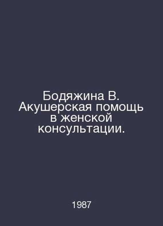 Bodyguard B. Antenatal care. In Russian /Bodyazhina V. Akusherskaya pomoshch v zhenskoy konsultatsii. Issue 2, BPR M Medicine 1987.Contact us for details or to request photos of available books. Delivery of this book could take longer than normal due to additional handling time before shipping, and no rush delivery options are available. Please let us know if you have a specific date by which you need to receive your order.SKUalb8182ec8363ecfc9a