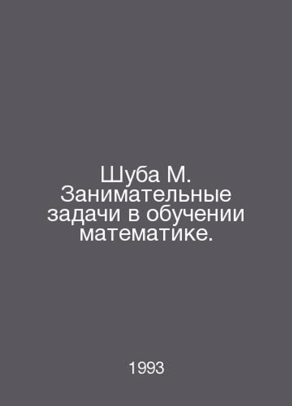 Shuba M. Exciting tasks in teaching mathematics. In Russian /Shuba M. Zanimatelnye zadachi v obuchenii matematike. M Enlightenment 1993.Contact us for details or to request photos of available books. Delivery of this book could take longer than normal due to additional handling time before shipping, and no rush delivery options are available. Please let us know if you have a specific date by which you need to receive your order.SKUalb8454efdb0f04bd7f
