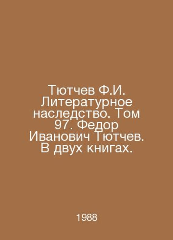 Tyutchev F.I. Literary heritage. Volume 97. Fedor Ivanovich Tyutchev. In two books. In Russian /Tyutchev F.I. Literaturnoe nasledstvo. Tom 97. Fedor Ivanovich Tyutchev. V dvukh knigakh. Academy of Sciences of the USSR Gorky Institute of World Literature. M Science. 1988. Contact us for details or to request photos of available books. Delivery of this book could take longer than normal due to additional handling time before shipping, and no rush delivery options are available. Please let us know if you have a specific date by which you need to receive your order. SKUalb87a10928145ccc7a