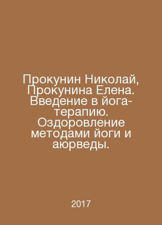 Nikolai Prokunin, Elena Prokunina. An introduction to yoga therapy In Russian /Prokunin Nikolay, Prokunina Elena. Vvedenie v yoga-terapiyu. Ozdorovlenie metodami yogi i ayurvedy. M Ganga. 2014. Contact us for details or to request photos of available books. Delivery of this book could take longer than normal due to additional handling time before shipping, and no rush delivery options are available. Please let us know if you have a specific date by which you need to receive your order. SKUalb06af61a68bec628b