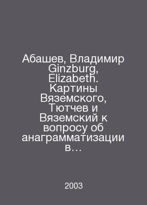 Abashev, Vladimir Ginzburg, Elizabeth. Paintings by Vyazemsky, Tyutchev, and Vyazemsky to the question of anagrams in their poem messages to each other. In Russian /Abashev, Vladimir Ginzburg, Elizabeth. Kartiny Vyazemskogo, Tyutchev i Vyazemskiy k voprosu ob anagrammatizatsii v ikh stikhotvornykh poslaniyakh drug-drugu. Russian Literature. Volume 53, Volume 1 Amsterdam. (Amsterdam) North-Holland. 2003.. Contact us for details or to request photos of available books. SKUalb8adf195f8a0a3e71.