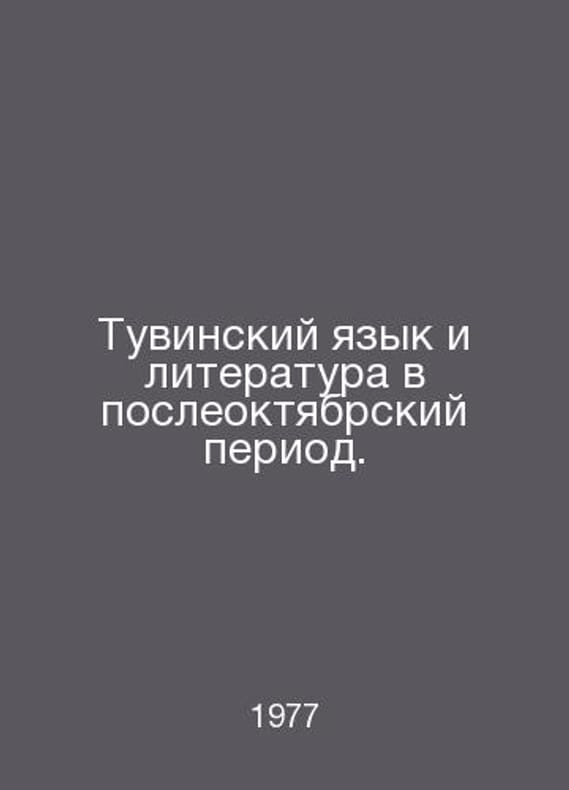 Tuvan language and literature in the post-October period. In Russian /Tuvinskiy yazyk i literatura v posleoktyabrskiy period. Tuva Research Institute of Language, Literature and History. Kyzyl. Tuva Research Institute of Language, Literature and History. 1977.. Contact us for details or to request photos of available books. SKUalb8b1f07f00edc7161.