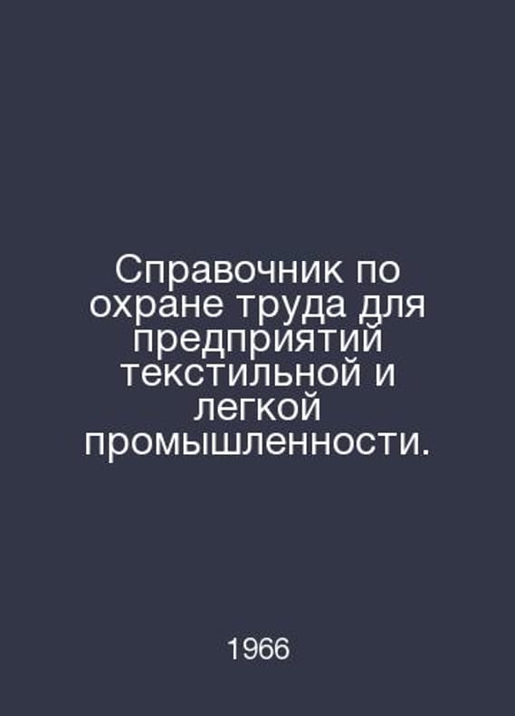 Handbook on Occupational Safety and Health for the Textile and Light Industry. In Russian /Spravochnik po okhrane truda dlya predpriyatiy tekstilnoy i legkoy promyshlennosti. Olntsev V. I., Sharov A. V. Under the editorship of A. Kiselev, Moscow Institute of Science and Technology 1966. Contact us for details or to request photos of available books. SKUalb8cd548589295ff11.