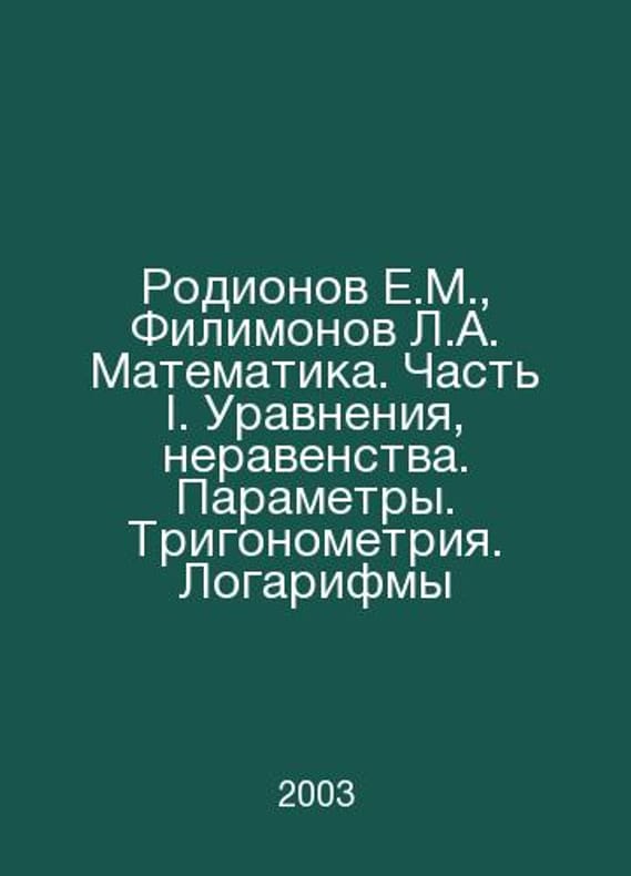 Rodionov E.M., Filimonov L.A. Mathematics. Part I. Equations, inequalities. Parameters. Trigonometry. Logarithms In Russian /Rodionov E.M., Filimonov L.A. Matematika. Chast I. Uravneniya, neravenstva. Parametry. Trigonometriya. Logarifmy Manual for Entry into Higher Education Institutions. Edition 2, revised and supplemented by M. The Orientation Training Center at N.E. Bauman Moscow State Technical University, 2003.Contact us for details or to request photos of available books. Delivery of this book could take longer than normal due to additional handling time before shipping, and no rush delivery options are available. Please let us know if you have a specific date by which you need to receive your order.SKUalb90f62a17acbfd782