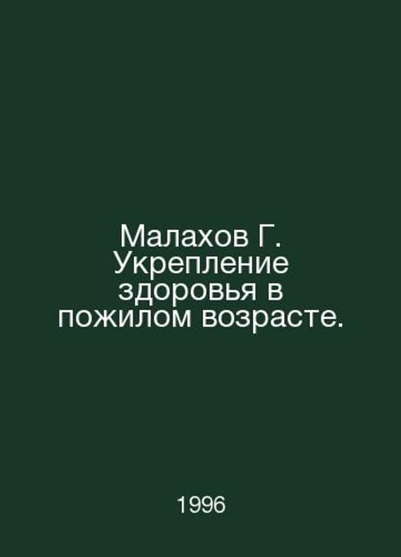 Malakhov G. Health promotion in old age. In Russian /Malakhov G. Ukreplenie zdorovya v pozhilom vozraste. SPB 1996.Contact us for details or to request photos of available books. Delivery of this book could take longer than normal due to additional handling time before shipping, and no rush delivery options are available. Please let us know if you have a specific date by which you need to receive your order.SKUalb91330c90e6d5a47c