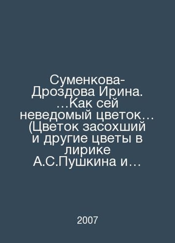 Sumenkova-Drozdova Irina. Like this unknown flower. (The flower dried up and other flowers in the lyrics of A.S. Pushkin and his contemporaries In Russian /Sumenkova-Drozdova Irina. Kak sey nevedomyy tsvetok (Tsvetok zasokhshiy i drugie tsvety v lirike A.S.Pushkina i ego sovremennikov) Graphics by Irina Mukhina were used. Old womans printing house 2007. Contact us for details or to request photos of available books. Delivery of this book could take longer than normal due to additional handling time before shipping, and no rush delivery options are available. Please let us know if you have a specific date by which you need to receive your order. SKUalb9289cff9512f258a
