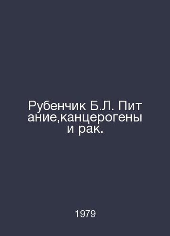 Rubber B.L. Nutrition, carcinogens and cancer. In Russian /Rubenchik B.L. Pitanie,kantserogeny i rak. Kiev. Naukova Dumka. 1979.Contact us for details or to request photos of available books. Delivery of this book could take longer than normal due to additional handling time before shipping, and no rush delivery options are available. Please let us know if you have a specific date by which you need to receive your order.SKUalb92baaf5b99869463