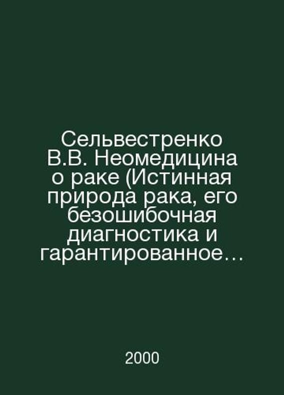 Selvestrenko V.V. Neomedicine about cancer (The true nature of cancer, its unmistakable diagnosis and guaranteed cure) In Russian /Selvestrenko V.V. Neomeditsina o rake (Istinnaya priroda raka, ego bezoshibochnaya diagnostika i garantirovannoe izlechenie) Moscow 2000. Contact us for details or to request photos of available books. Delivery of this book could take longer than normal due to additional handling time before shipping, and no rush delivery options are available. Please let us know if you have a specific date by which you need to receive your order.SKUalb93b4d50a8e500ad7