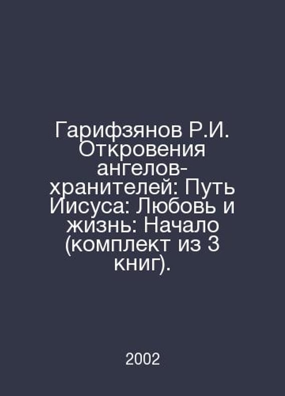 R.I. Garifzyanovs Revelations of the Guardian Angels: The Way of Jesus: Love and Life: The Beginning (set of 3 books). In Russian /Garifzyanov R.I. Otkroveniya angelov-khraniteley: Put Iisusa: Lyubov i zhizn: Nachalo (komplekt iz 3 knig). Revelations of the guardian angels of M. Ast. 2002. Contact us for details or to request photos of available books. Delivery of this book could take longer than normal due to additional handling time before shipping, and no rush delivery options are available. Please let us know if you have a specific date by which you need to receive your order. SKUalb93c864d9c8becc12
