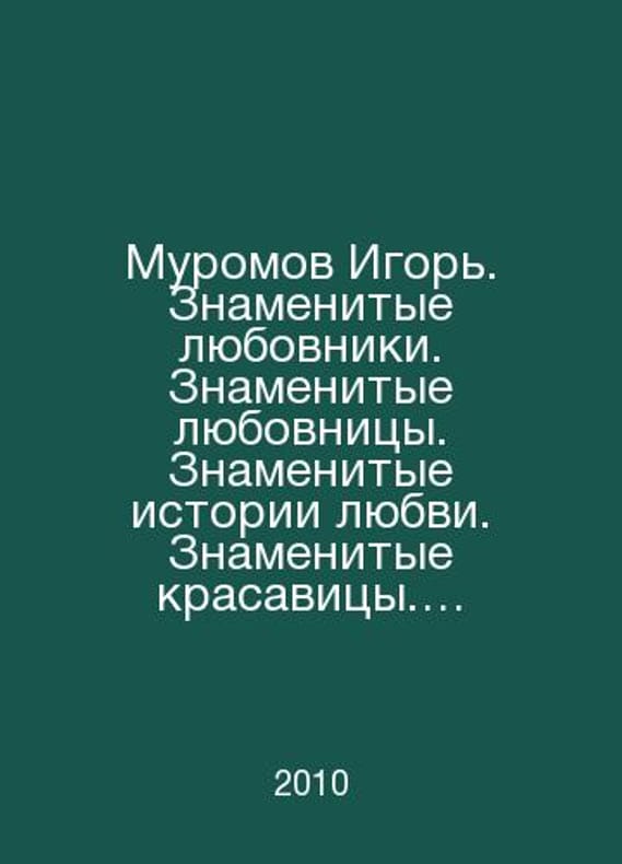 Igor Muromov. Famous Lovers. Famous Lovers. Famous Love Stories. Famous Beauties. Famous Couples. In Russian /Muromov Igor.† Znamenitye lyubovniki. Znamenitye lyubovnitsy. Znamenitye istorii lyubvi. Znamenitye krasavitsy. Znamenitye supruzheskie pary. Series: Stories of Eternal Love. Moscow. Veche. 2010. Contact us for details or to request photos of available books. Delivery of this book could take longer than normal due to additional handling time before shipping, and no rush delivery options are available. Please let us know if you have a specific date by which you need to receive your order. SKUalb94d7beadb955a3e7