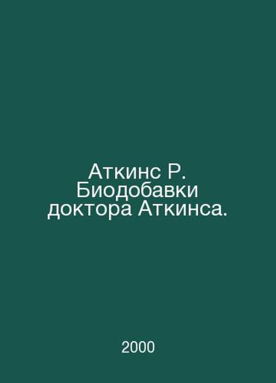 Dr. Atkins R. Dietary Supplements. In Russian /Atkins R. Biodobavki doktora Atkinsa. M. Ripoll 2001, 480 p.We have thousands of titles and often several copies of each title may be available. Please feel free to contact us for a detailed description of the copies available.SKUalb0d2b96f524bffb8e.