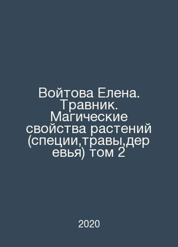 Voitova Elena. Travnik. Magical Properties of Plants (Spices, Herbs, Trees) Volume 2 In Russian /Voytova Elena. Travnik. Magicheskie svoystva rasteniy (spetsii,travy,derevya) tom 2 M. Veligor 2020. Contact us for details or to request photos of available books. Delivery of this book could take longer than normal due to additional handling time before shipping, and no rush delivery options are available. Please let us know if you have a specific date by which you need to receive your order. SKUalb95ad0c012b60155e