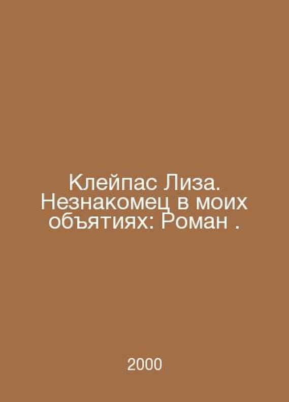 Claypas Lisa. Stranger in My Embrace: Roman. In Russian /Kleypas Liza. Neznakomets v moikh obyatiyakh: Roman. Translated from English by L. V. Sazonova: Serial Decoration by E. N. Volchenko: (Charm). Moscow: AST, 2000. Contact us for details or to request photos of available books. Delivery of this book could take longer than normal due to additional handling time before shipping, and no rush delivery options are available. Please let us know if you have a specific date by which you need to receive your order. SKUalb95f4281582c58b94