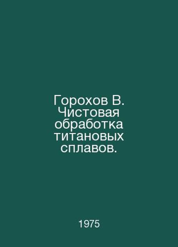 Peas B. Clean processing of titanium alloys. In Russian /Gorokhov V. Chistovaya obrabotka titanovykh splavov. M Engineering 1975. Contact us for details or to request photos of available books. Delivery of this book could take longer than normal due to additional handling time before shipping, and no rush delivery options are available. Please let us know if you have a specific date by which you need to receive your order.SKUalb9600530964098662