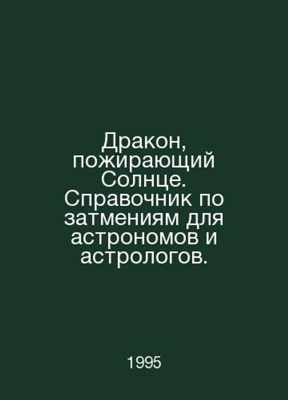 A dragon devouring the Sun. A guide to eclipses for astronomers and astrologers. In Russian /Drakon, pozhirayushchiy Solntse. Spravochnik po zatmeniyam dlya astronomov i astrologov. Compiled and edited by S. Yu. Maslikov. Tomsk. Zodiac. 1995. Contact us for details or to request photos of available books. Delivery of this book could take longer than normal due to additional handling time before shipping, and no rush delivery options are available. Please let us know if you have a specific date by which you need to receive your order. SKUalb96092e13769d2025
