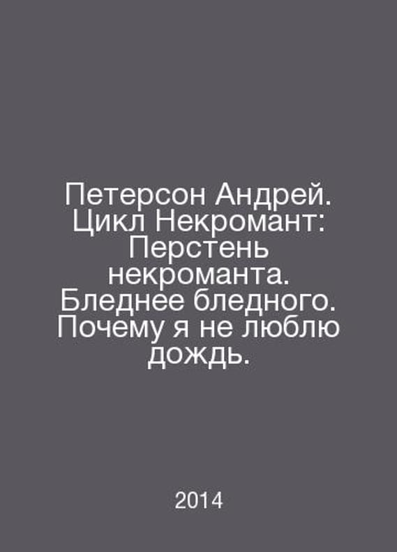Peterson Andrei. Necromant Cycle: Necromant ring. Pale. Why I dont like rain. In Russian /Peterson Andrey. Tsikl Nekromant: Persten nekromanta. Blednee blednogo. Pochemu ya ne lyublyu dozhd. Moscow ID Leningrad 2014. Contact us for details or to request photos of available books. Delivery of this book could take longer than normal due to additional handling time before shipping, and no rush delivery options are available. Please let us know if you have a specific date by which you need to receive your order.SKUalb971be48268bf9e85