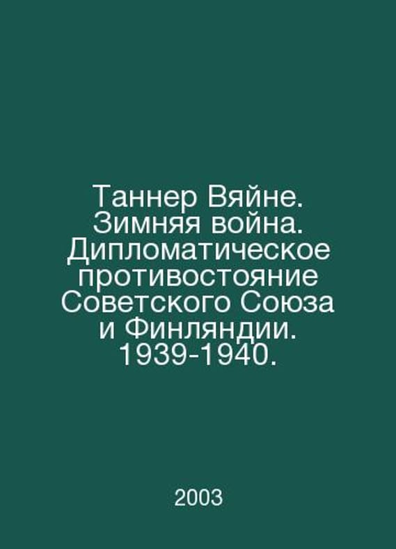 Tanner Veine. Winter War. Diplomatic confrontation between the Soviet Union and Finland. 1939-1940. In Russian /Tanner Vyayne. Zimnyaya voyna. Diplomaticheskoe protivostoyanie Sovetskogo Soyuza i Finlyandii. 1939-1940. Diplomatic confrontation between the Soviet Union and Finland 1939-1940.Contact us for details or to request photos of available books. Delivery of this book could take longer than normal due to additional handling time before shipping, and no rush delivery options are available. Please let us know if you have a specific date by which you need to receive your order.SKUalb97b62f1fedc69abb