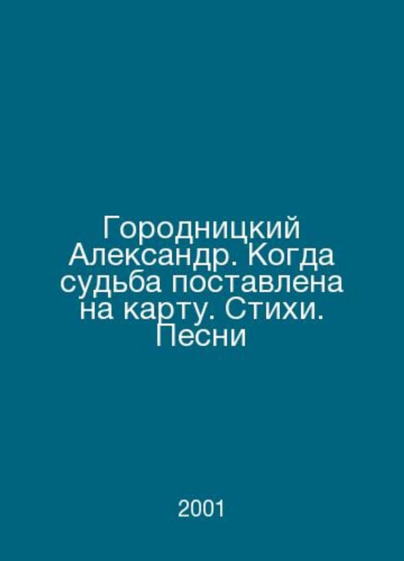 Alexander Gorodnitsky. When fate is at stake. Poems. Songs In Russian /Gorodnitskiy Aleksandr. Kogda sudba postavlena na kartu. Stikhi. Pesni M. Exmo-Press 2001.Contact us for details or to request photos of available books. Delivery of this book could take longer than normal due to additional handling time before shipping, and no rush delivery options are available. Please let us know if you have a specific date by which you need to receive your order.SKUalb9ac0304584b22639