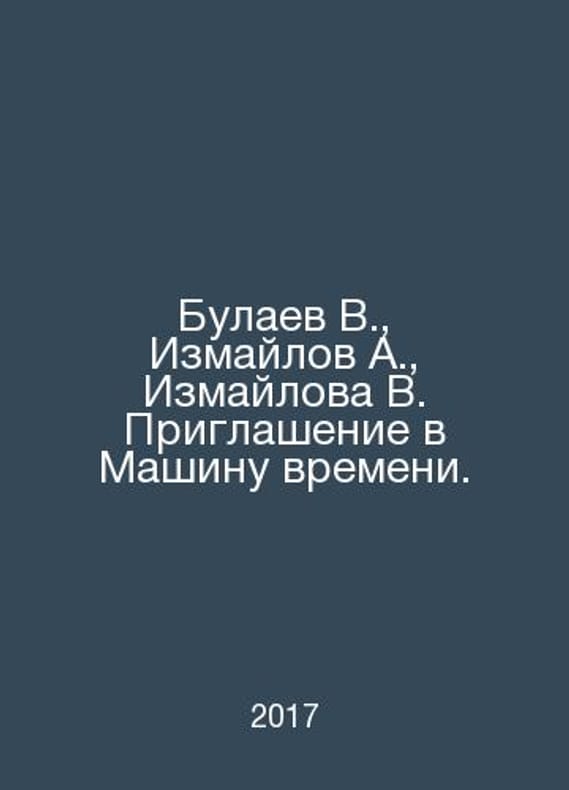 Bulaev V., Izmailov A., Izmailova V. Invitation to the Time Machine. In Russian /Bulaev V., Izmaylov A., Izmaylova V. Priglashenie v Mashinu vremeni. Barnaul IP Kolmagorov 2017 year. Contact us for details or to request photos of available books. Delivery of this book could take longer than normal due to additional handling time before shipping, and no rush delivery options are available. Please let us know if you have a specific date by which you need to receive your order. SKUalb9b84bbb2297dc273