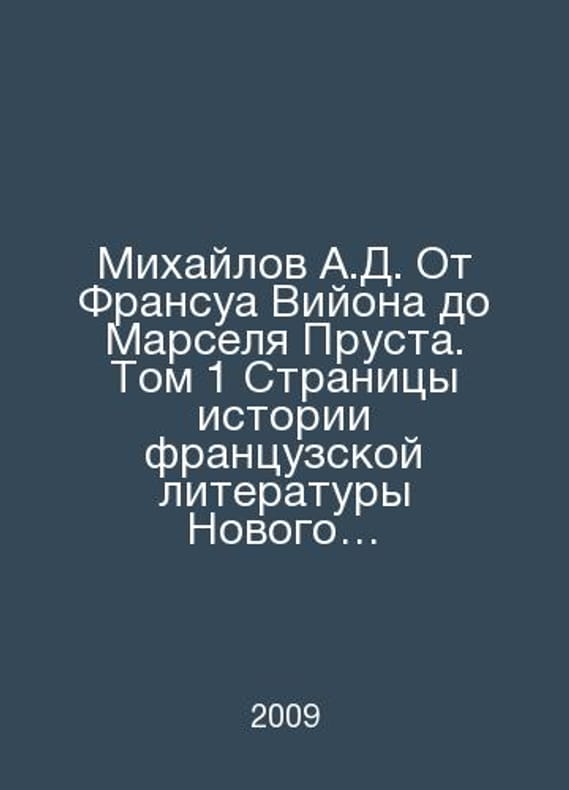 Mikhailov A.D. From Francois Villon to Marcel Proust. Volume 1 Pages of the History of Modern French Literature (XVI-XIX). In Russian /Mikhaylov A.D. Ot Fransua Viyona do Marselya Prusta.†Tom 1 Stranitsy istorii frantsuzskoy literatury Novogo vremeni (XVI-XIX). M. Languages of Slavic cultures 2009. Contact us for details or to request photos of available books. Delivery of this book could take longer than normal due to additional handling time before shipping, and no rush delivery options are available. Please let us know if you have a specific date by which you need to receive your order. SKUalb9b8c79de93ecab96