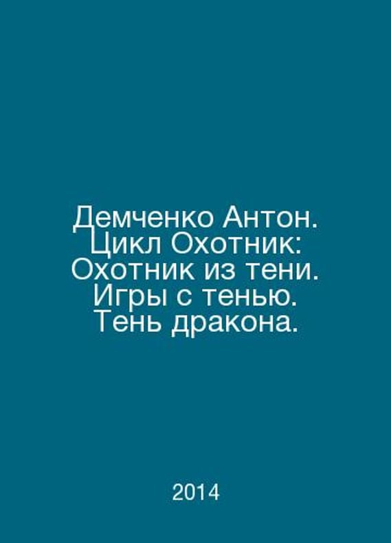 Demchenko Anton. The cycle Hunter: Hunter from the Shadows. Shadow Games. Shadow of the Dragon. In Russian /Demchenko Anton. Tsikl Okhotnik: Okhotnik iz teni. Igry s tenyu. Ten drakona. Moscow ID Leningrad 2014. Contact us for details or to request photos of available books. Delivery of this book could take longer than normal due to additional handling time before shipping, and no rush delivery options are available. Please let us know if you have a specific date by which you need to receive your order.SKUalb9c6e01b27b68410a