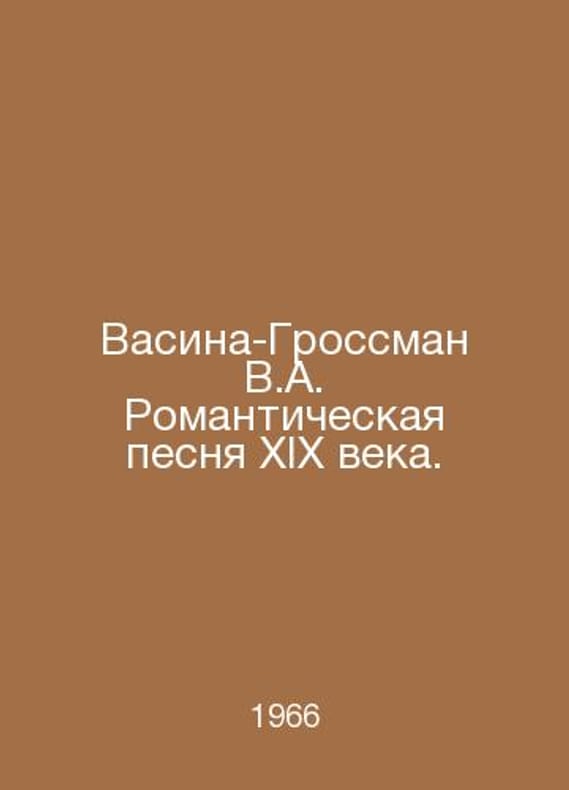 Vasina-Grossman V.A. A nineteenth-century romantic song. In Russian /Vasina-Grossman V.A. Romanticheskaya pesnya XIX veka. M.: Music, 1966. Contact us for details or to request photos of available books. Delivery of this book could take longer than normal due to additional handling time before shipping, and no rush delivery options are available. Please let us know if you have a specific date by which you need to receive your order.SKUalb9fb151cbbd3676bc