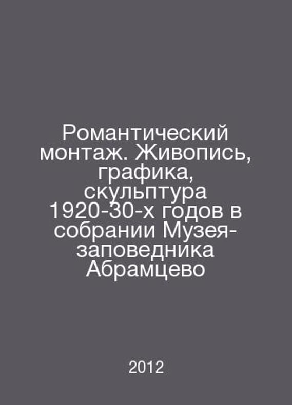 Romantic montage. Painting, graphics, sculpture from the 1920s-1930s in the collection of the Abramtsevo Museum-Reserve In Russian /Romanticheskiy montazh. Zhivopis, grafika, skulptura 1920-30-kh godov v sobranii Muzeya-zapovednika Abramtsevo Catalog of the exhibition M. Abramtsevo Museum-Reserve 2012. Contact us for details or to request photos of available books. Delivery of this book could take longer than normal due to additional handling time before shipping, and no rush delivery options are available. Please let us know if you have a specific date by which you need to receive your order.SKUalb9fdb509cb3fdb012