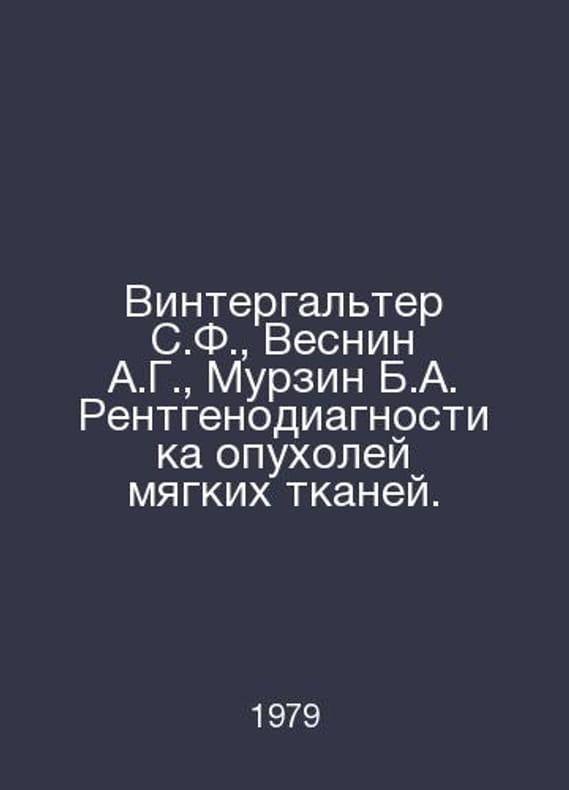 Wintergalter S.F., Vesnin A.G., Murzin B.A. Radiodiagnosis of soft tissue tumors. In Russian /Vintergalter S.F., Vesnin A.G., Murzin B.A. Rentgenodiagnostika opukholey myagkikh tkaney. Circulation of 12,000 copies of M. Medicine 1979.. Contact us for details or to request photos of available books. SKUalba0306ead4ee6c7f3.