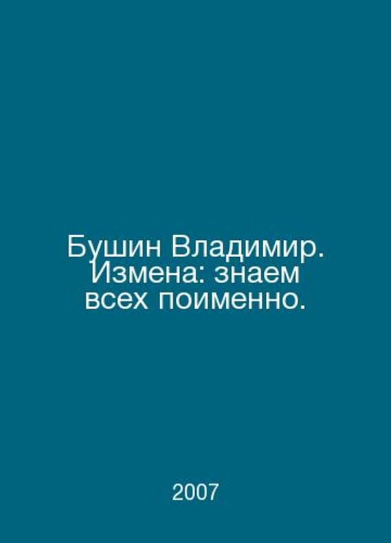 Vladimir Bushin. Treason: we know everyone by name. In Russian /Bushin Vladimir. Izmena: znaem vsekh poimenno. M. Algorithm. 2007.Contact us for details or to request photos of available books. Delivery of this book could take longer than normal due to additional handling time before shipping, and no rush delivery options are available. Please let us know if you have a specific date by which you need to receive your order.SKUalba04b1009cf7e1b04