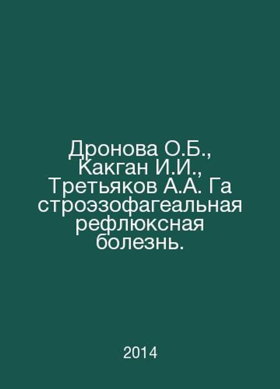 Dronova O.B., Kakgan I.I., Tretyakov A.A. Gastroesophageal reflux disease. In Russian /Dronova O.B., Kakgan I.I., Tretyakov A.A. Gastroezofagealnaya reflyuksnaya bolezn. M. Binom. 2014 year..Contact us for details or to request photos of available books. Delivery of this book could take longer than normal due to additional handling time before shipping, and no rush delivery options are available. Please let us know if you have a specific date by which you need to receive your order. SKUalba16d7ac6f9262327