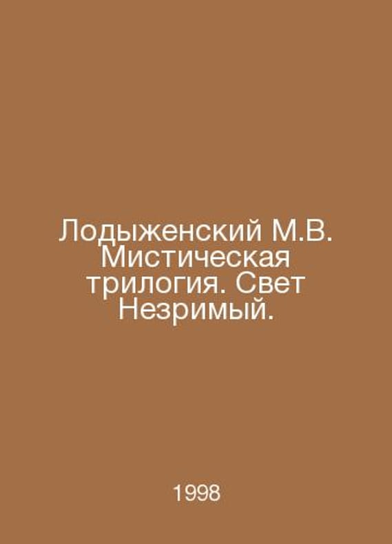 Lodyzhensky M.V. The Mystical Trilogy. Light Invisible. In Russian /Lodyzhenskiy M.V. Misticheskaya trilogiya. Svet Nezrimyy. Volume 2. M. Edition of the Orthodox Brotherhood. 1998. Contact us for details or to request photos of available books. Delivery of this book could take longer than normal due to additional handling time before shipping, and no rush delivery options are available. Please let us know if you have a specific date by which you need to receive your order. SKUalba222802e1e475fce