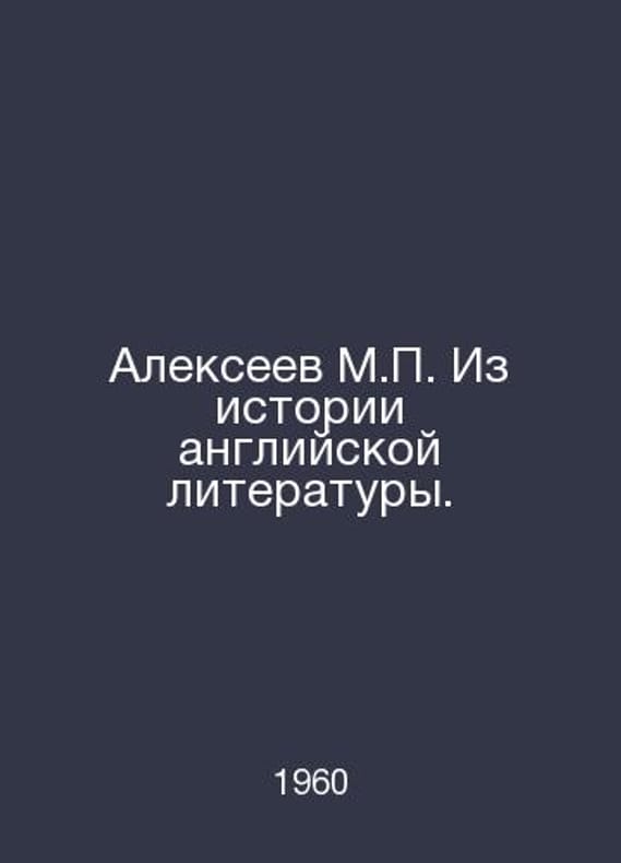 Alexeev M. From the History of English Literature. In Russian /Alekseev M. Iz istorii angliyskoy literatury. Studies, Essays, and Studies by M.-L.: Art Literature, 1960. Contact us for details or to request photos of available books. Delivery of this book could take longer than normal due to additional handling time before shipping, and no rush delivery options are available. Please let us know if you have a specific date by which you need to receive your order. SKUalba2903dbfd63f6b6a