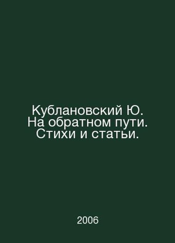 Kublanovsky Yu. On the way back. Poems and articles. In Russian /Kublanovskiy Yu. Na obratnom puti. Stikhi i stati. M. Russkiy mir. 2006.Contact us for details or to request photos of available books. Delivery of this book could take longer than normal due to additional handling time before shipping, and no rush delivery options are available. Please let us know if you have a specific date by which you need to receive your order.SKUalba30d1fe54bedde7b