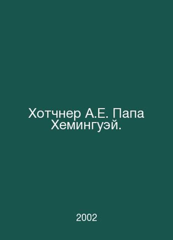 Hotchner A.E. Papa Hemingway. In Russian /Khotchner A.E. Papa Kheminguey. M. Text 2002.Contact us for details or to request photos of available books. Delivery of this book could take longer than normal due to additional handling time before shipping, and no rush delivery options are available. Please let us know if you have a specific date by which you need to receive your order.SKUalba35aca05ec0c803e