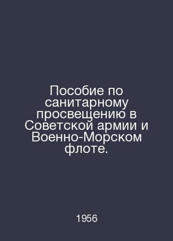 Health Education Manual in the Soviet Army and Navy. In Russian /Posobie po sanitarnomu prosveshcheniyu v Sovetskoy armii i Voenno-Morskom flote. M Voizdat 1956.Contact us for details or to request photos of available books. Delivery of this book could take longer than normal due to additional handling time before shipping, and no rush delivery options are available. Please let us know if you have a specific date by which you need to receive your order.SKUalba3cee6b25ed3f9e9