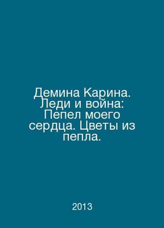 Demina Karina. Lady and War: The Ash of My Heart. Flowers from the Ash. In Russian /Demina Karina. Ledi i voyna: Pepel moego serdtsa. Tsvety iz pepla. Series: Romantic fiction. M. Alpha-book 2013. Contact us for details or to request photos of available books. Delivery of this book could take longer than normal due to additional handling time before shipping, and no rush delivery options are available. Please let us know if you have a specific date by which you need to receive your order. SKUalba47088a0906623a3