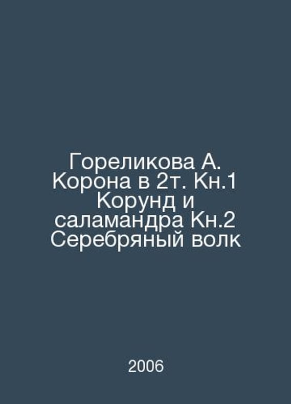 Gorelikova A. Crown in Book 2 Corundum and Salamander Book 2 Silver Wolf In Russian /Gorelikova A. Korona v 2t. Kn.1 Korund i salamandra Kn.2 Serebryanyy volk Series: Mens Club Historical Adventure of St. Petersburg Krylov 2006. Contact us for details or to request photos of available books. Delivery of this book could take longer than normal due to additional handling time before shipping, and no rush delivery options are available. Please let us know if you have a specific date by which you need to receive your order.SKUalba4d0e99a849d32d6