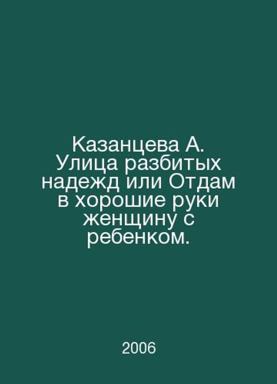 A. Kazantseva Street of broken hopes or I will put a woman and child in good hands. In Russian /Kazantseva A. Ulitsa razbitykh nadezhd ili Otdam v khoroshie ruki zhenshchinu s rebenkom. M. Ast 2006.Contact us for details or to request photos of available books. Delivery of this book could take longer than normal due to additional handling time before shipping, and no rush delivery options are available. Please let us know if you have a specific date by which you need to receive your order.SKUalba807b3d656b44e23