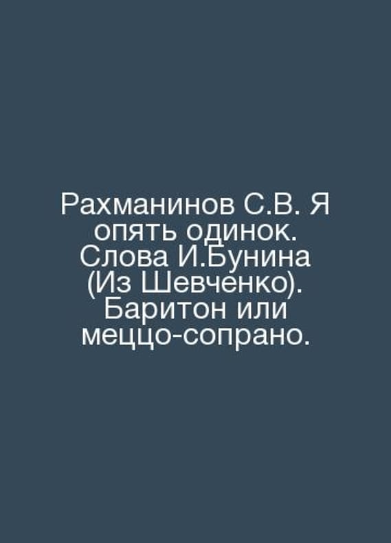 Rachmaninov S.V. I am alone again. Words by I. Bunin (From Shevchenko). Baritone or mezzo-soprano. In Russian /Rakhmaninov S.V. Ya opyat odinok. Slova I.Bunina (Iz Shevchenko). Bariton ili metstso-soprano. Romances. Moscow. Publisher A. Gutheil. 6 Contact us for details or to request photos of available books. Delivery of this book could take longer than normal due to additional handling time before shipping, and no rush delivery options are available. Please let us know if you have a specific date by which you need to receive your order.SKUalba9e35f68a9c875ad