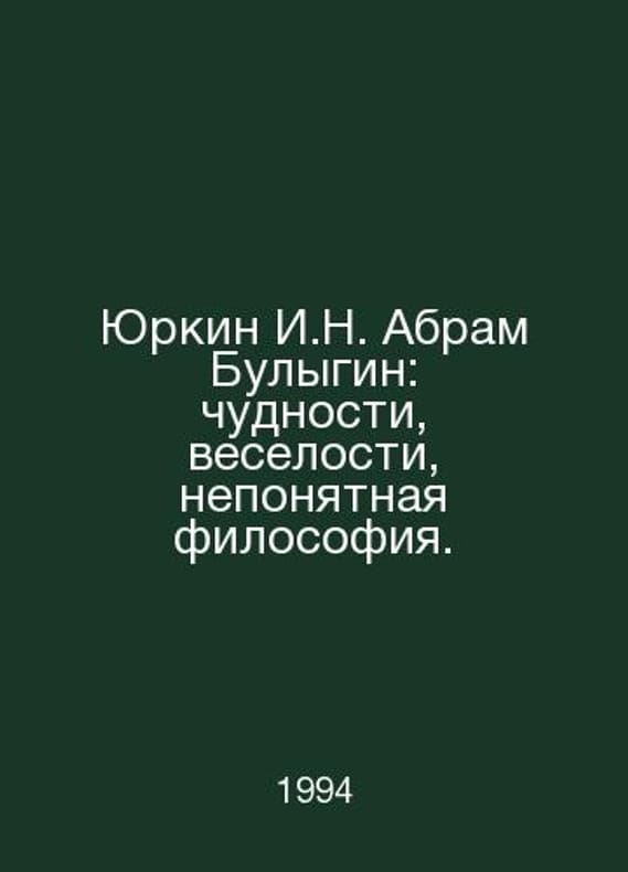 Yurkin I.N. Abram Bulygin: wonders, miracles, incomprehensible philosophy. In Russian /Yurkin I.N. Abram Bulygin: chudnosti, veselosti, neponyatnaya filosofiya. Tula Rarus. 1994. Contact us for details or to request photos of available books. Delivery of this book could take longer than normal due to additional handling time before shipping, and no rush delivery options are available. Please let us know if you have a specific date by which you need to receive your order.SKUalbad81ef574542eaea