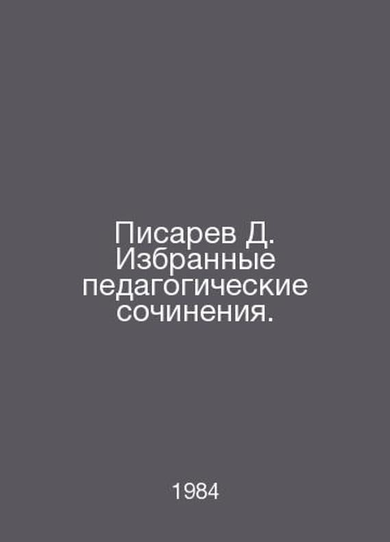 D. Pisarev Selected pedagogical works. In Russian /Pisarev D. Izbrannye pedagogicheskie sochineniya. Series Educational Library M Education 1984.Contact us for details or to request photos of available books. Delivery of this book could take longer than normal due to additional handling time before shipping, and no rush delivery options are available. Please let us know if you have a specific date by which you need to receive your order.SKUalbadabe43ebb627e13