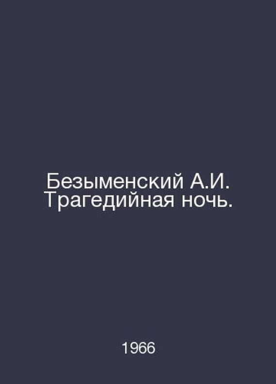 Bezymensky A.I. Tragedy night. In Russian /Bezymenskiy A.I. Tragediynaya noch. M Soviet writer 1966.Contact us for details or to request photos of available books. Delivery of this book could take longer than normal due to additional handling time before shipping, and no rush delivery options are available. Please let us know if you have a specific date by which you need to receive your order.SKUalbaf02706a9fcfac1f