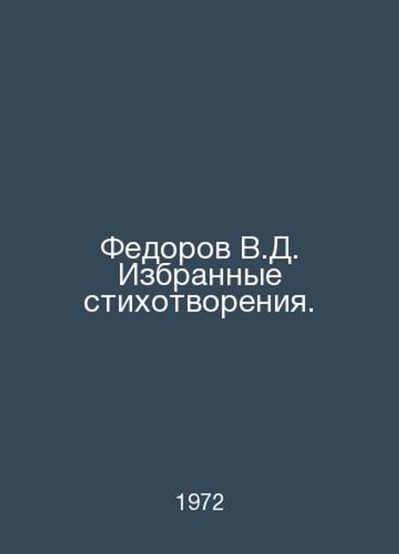 Feodorov V.D. Selected poems. In Russian /Fedorov V.D. Izbrannye stikhotvoreniya. G. Kravtsov Kemerovo Kemerovo Book Publishing House 1972.Contact us for details or to request photos of available books. Delivery of this book could take longer than normal due to additional handling time before shipping, and no rush delivery options are available. Please let us know if you have a specific date by which you need to receive your order.SKUalbaf845f63b8e0ca4b