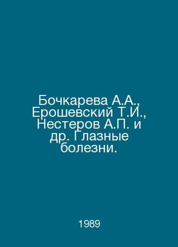 Bochkareva A.A., Eroshevsky T.I., Nesterov A. et al. Eye diseases. In Russian /Bochkareva A.A., Eroshevskiy T.I., Nesterov A. i dr. Glaznye bolezni. Edited by A. Bochkareva. Educational literature. For medical students. Edition 3, revised and supplemented. M. Medicine. 1989.Contact us for details or to request photos of available books. Delivery of this book could take longer than normal due to additional handling time before shipping, and no rush delivery options are available. Please let us know if you have a specific date by which you need to receive your order.SKUalbb0739f3709d15071