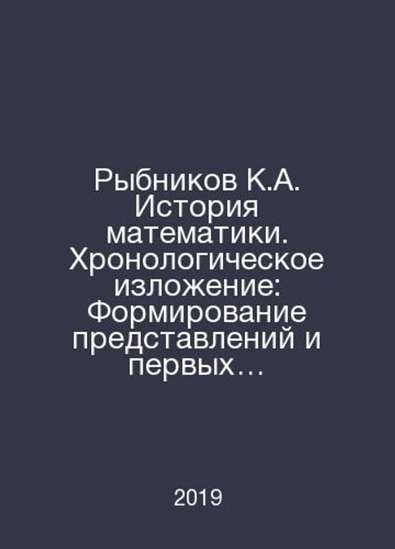 Rybnikov K.A. History of mathematics. Timeline: Formation of perceptions and first theories. Development of elementary mathematics. Process of creation of mathematics of variables. Development of basic parts of mathematics in the 18th century. Beginning of the period of modern mathematics In Russian /Rybnikov K.A. Istoriya matematiki. Khronologicheskoe izlozhenie: Formirovanie predstavleniy i pervykh teoriy.Razvitie elementarnoy matematiki.Protsess sozdaniya matematiki peremennykh velichin. Razvitie osnovnykh chastey matematiki v XVIII veke. Nachalo perioda sovremennoy matemat Textbook. Edition 3 (Classical textbook of Moscow State University) Moscow LENAND 2019..Contact us for details or to request photos of available books. Delivery of this book could take longer than normal due to additional handling time before shipping, and no rush delivery options are available. Please let us know if you have a specific date by which you need to receive your order. SKUalbb10cc77ef017f9a8