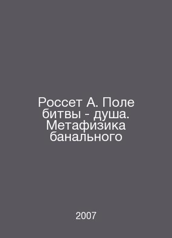 Rosset A. The battlefield is the soul. The metaphysics of the banal In Russian /Rosset A. Pole bitvy - dusha. Metafizika banalnogo Artist. N. V. Yudin S.Pb.Aleteya 2007. Contact us for details or to request photos of available books. Delivery of this book could take longer than normal due to additional handling time before shipping, and no rush delivery options are available. Please let us know if you have a specific date by which you need to receive your order. SKUalbb2ce42d5f77c9f07