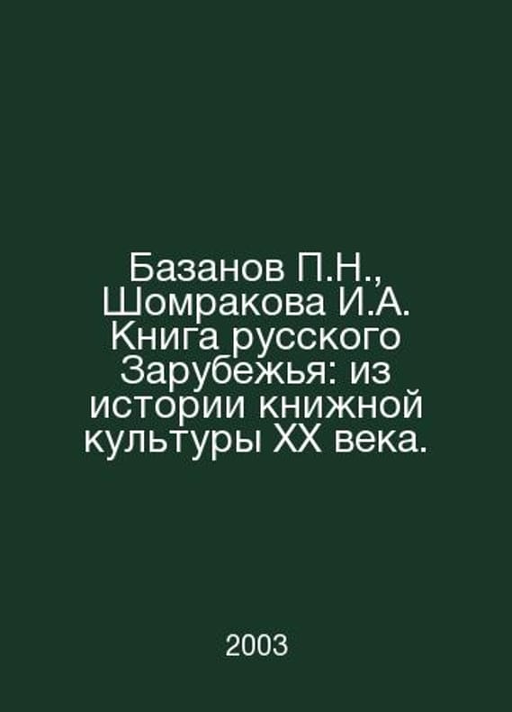 N. Bazanov, I.A. Shomrakova The Book of Russian Diaspora: From the History of Book Culture of the XX Century. In Russian /Bazanov N., Shomrakova I.A. Kniga russkogo Zarubezhya: iz istorii knizhnoy kultury KhKh veka. Textbook. St. Petersburg, St. Petersburg Institute of Print, 2003.. Contact us for details or to request photos of available books. SKUalbb2f331afad2099ca.